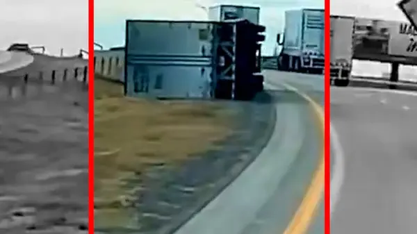 فیلم واژگون شدن کامیون بر اثر باد شدید در آمریکا