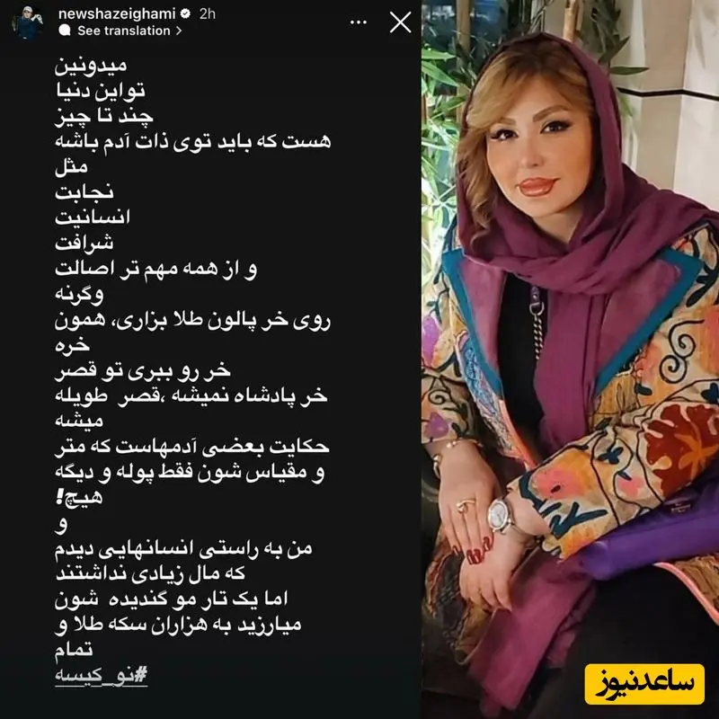 نیوشا ضیغمی بعد از حضور فریبا نادری و صحبت های او درباره زندگی پولداری استوری منتشر کرد که مورد توجه کاربران قرار گرفته است.
